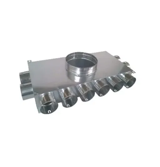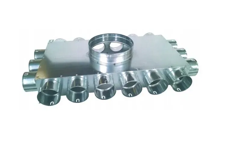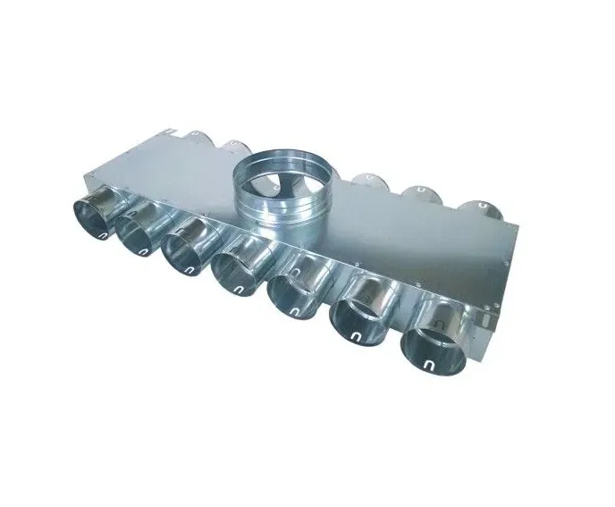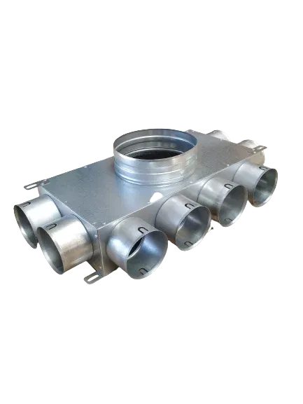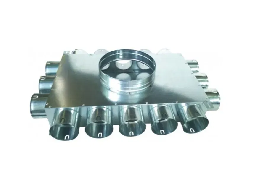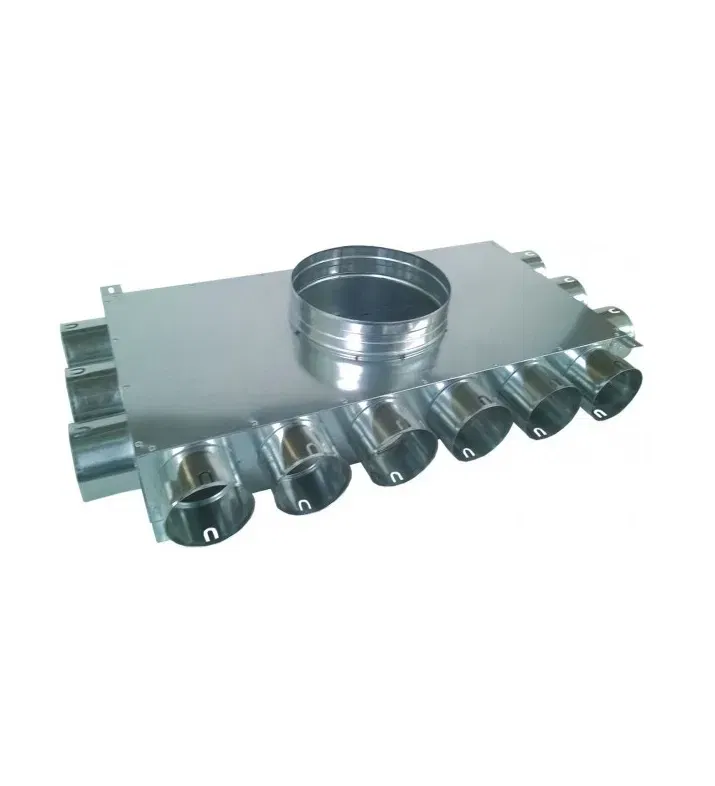Rozdzielacz kątowy dwustronny , trójstronny lub czterostronny , w zależności od wyboru 8/12/14/16/18-króćcowy do montażu po stronie nawiewu jak i wywiewu. Rozdzielacz przystosowany do montażu w wylewkach jak i na suficie. Podłączenia przewodów Ø75 mm do rozdzielacza odbywa się bez dodatkowych spinek, zawleczek. Wystarczy nałożyć na przewód uszczelkę gumową a następnie wsunąć przewód bezpośrednio do króćców przyłączeniowych rozdzielacza. Skrzynka nie zawiera uszczelek.