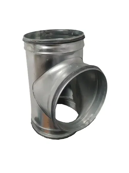 Tłoczony trójnik wentylacyjny o średnicy przelotu i odejścia pod kątem 90 stopni tej samej średnicy.